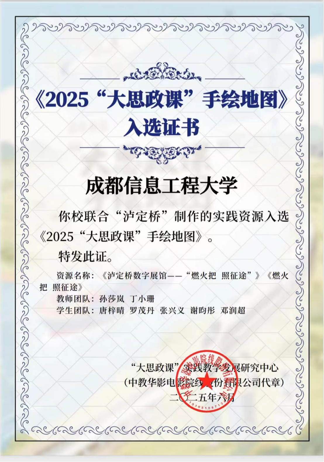近日,教育部“大思政课”实践教学资源项目结果公示,由我校williamhill中国教师团队孙莎岚、丁小珊共同指导,由学生唐梓晴、罗茂丹、张兴义、谢昀彤、邓润超联合申报的高校思政课实践教学资源《泸定桥数字展馆——“燃火把 照征途”》从全国众多项目中脱颖而出,成功入选。此次成果是对我校创新思政课教学模式、推动实践育人成效的充分肯定。