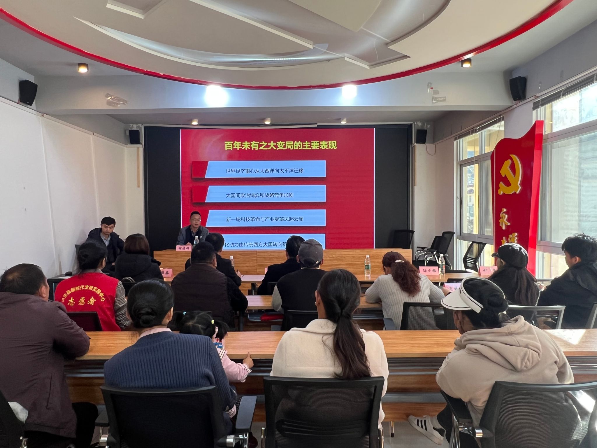 座谈调研中,谢清明、闵卫东等与烹坝镇负责人与沙湾村“两委”干部就如何推进乡村党建、文化建设、依法治村、农产品营销等乡村振兴存在的问题和未来发展方向进行了深入的交流,文化艺术学院还结合学科特色就村容村貌美化及农特产品品牌设计等进行了专题探讨,就合作方向达成初步意向。随后,谢清明依托williamhill中国的学科优势,以“学思想,悟精神,为建设中国式现代化奋力前行”为题,为当地干部和群众作了一堂党建专题报告,他紧紧围绕党的二十大精神,从“中国共产党百年奋斗的历史经验、百年未有之大变局的历史关口、第四次工业革命的历史机遇、全面小康实现后新的历史任务”等四个方面进行了深入阐述,“无论我们走得多远,都不能忘记来时的路。”谢清明强调,“我们从乡村走来,必然不能忘记振兴乡村,中国式现代化道路不能落下乡村,全面推进乡村振兴是实现中国式现代化的关键所在。”