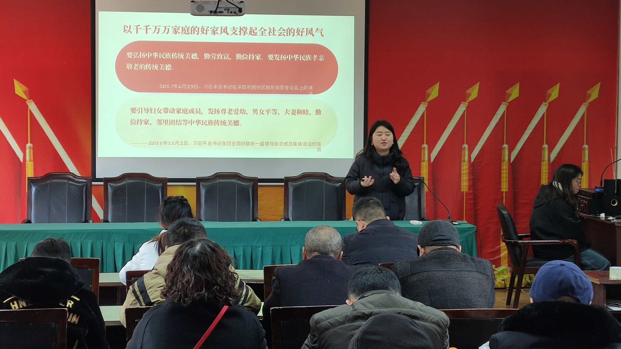 信马铸魂宣讲团成员张兴义从介绍忠诚家风、诚信家风等十大优良家风入题,向大家分享了孟母三迁、曾子杀猪等家风历史故事,并结合社会现实,继续向现场人员列举了现实生活中不良家风所造成的不良案例,最后以习近平总书记的家风故事升华了本次宣讲主题。本次宣讲得到了共耕社区两委同志的高度评价,他们说到,宣讲内容丰富生动、效果很好,希望以后有机会可以加强长期学习交流。