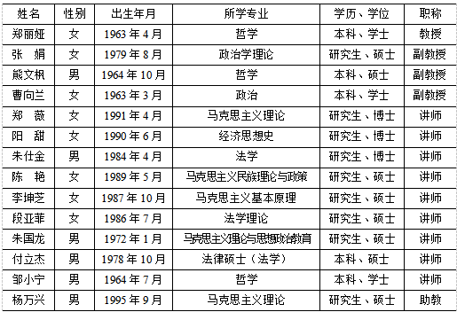 马克思主义中国化学科方向现有教师15人,其中教授1人,副教授5人,讲师7人,助教2人。具有博士学位4人(占27%),具有硕士学位9人(占60%),形成了专业、学历、职称、年龄结构合理的学科研究队伍。主要研究方向包括马克思主义中国化、中国领导人科技思想和群众思想、政府规制与公共管理、基层治理等。